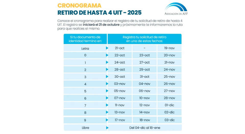 Según el calendario oficial difundido por la Asociación de AFP, las fechas de inscripción para el retiro son las siguientes: