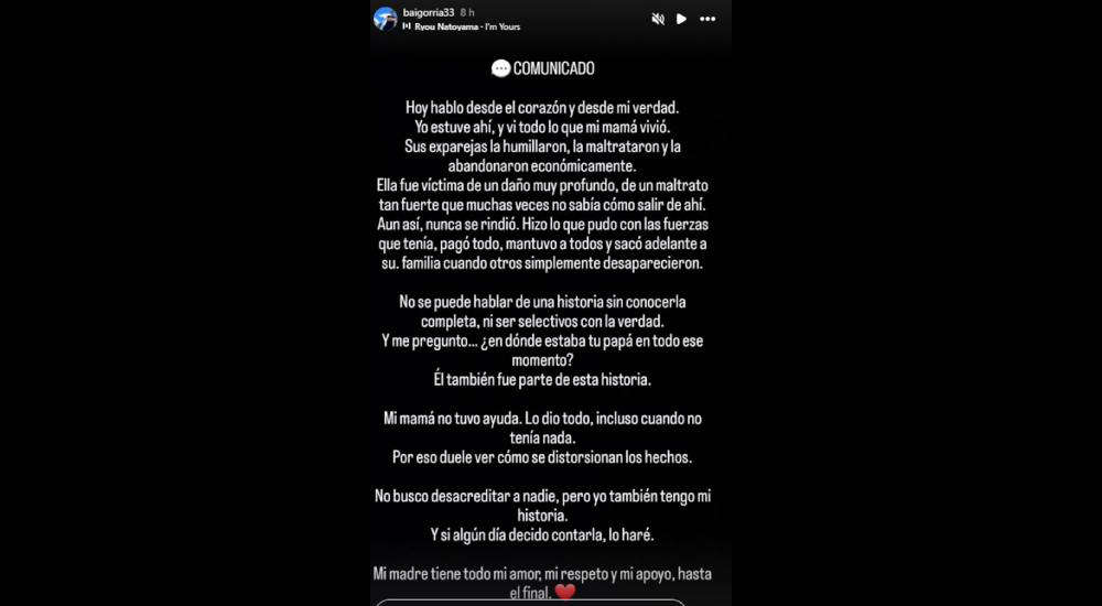 Finalmente, el hermano de Alejandra Baigorria lanzó un mensaje directo que muchos interpretaron como una respuesta a Thamara Medina. “No se puede hablar de una historia sin conocerla completa, ni ser selectivos con la verdad. Y me pregunto... ¿en dónde estaba tu papá en todo ese momento? Él también fue parte de esta historia. Mi mamá no tuvo ayuda. Lo dio todo, incluso cuando no tenía nada”, afirmó con contundencia, defendiendo una vez más a su madre de las duras acusaciones.