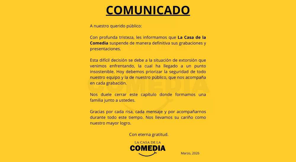 La inseguridad continúa creciendo y ahora también afecta al mundo del entretenimiento digital. El programa de streaming 'La Casa de la Comedia' anunció que cerrará de forma definitiva luego de haber sido víctima de extorsión.