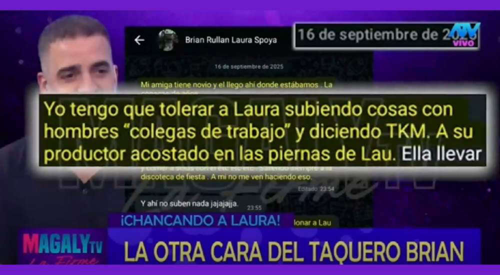 En la última emisión del programa de Magaly Medina se mostraron unos chats atribuidos a Brian Rullán, donde el empresario mexicano lanzaba comentarios, quejas y acusaciones sobre su expareja, Laura Spoya. En esos mensajes también mencionaba al productor que trabaja con la exreina de belleza, lo que generó aún más polémica en redes.