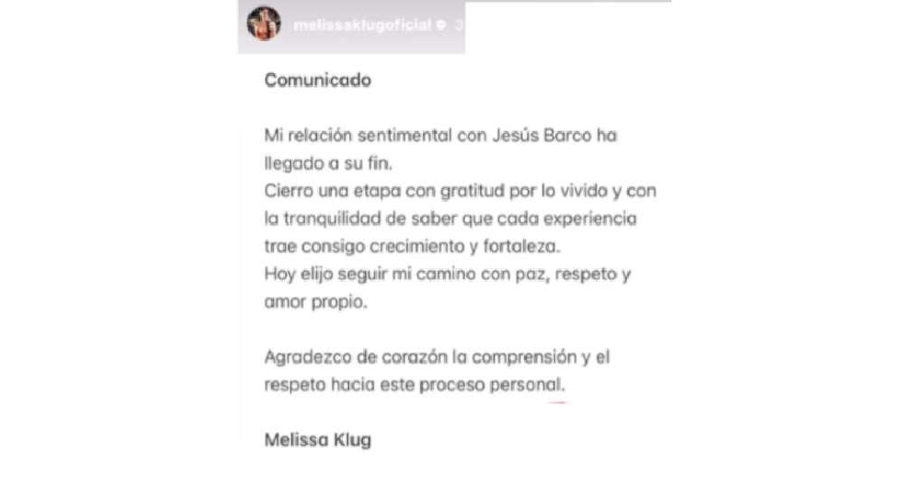 En el comunicado, Melissa Klug expresó: “Mi relación sentimental con Jesús Barco ha llegado a su fin. Cierro una etapa con gratitud por lo vivido y con la tranquilidad de saber que cada experiencia trae consigo crecimiento y fortaleza”.