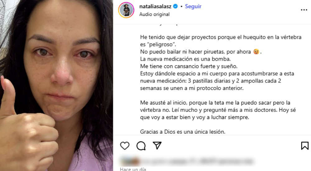 Según explicó Natalia Salas, el diagnóstico fue detectado gracias a sus revisiones médicas constantes. Por eso, resaltó la importancia de la prevención. “El mes pasado fue un huracán de emociones en mi vida y la de mi familia. Mis imágenes no salieron limpias. Metástasis. ¿Suena fuerte no? El cáncer de mama que me diagnosticaron hace 3 años decidió salir a pasear y posarse en una de mis vértebras”, contó.
