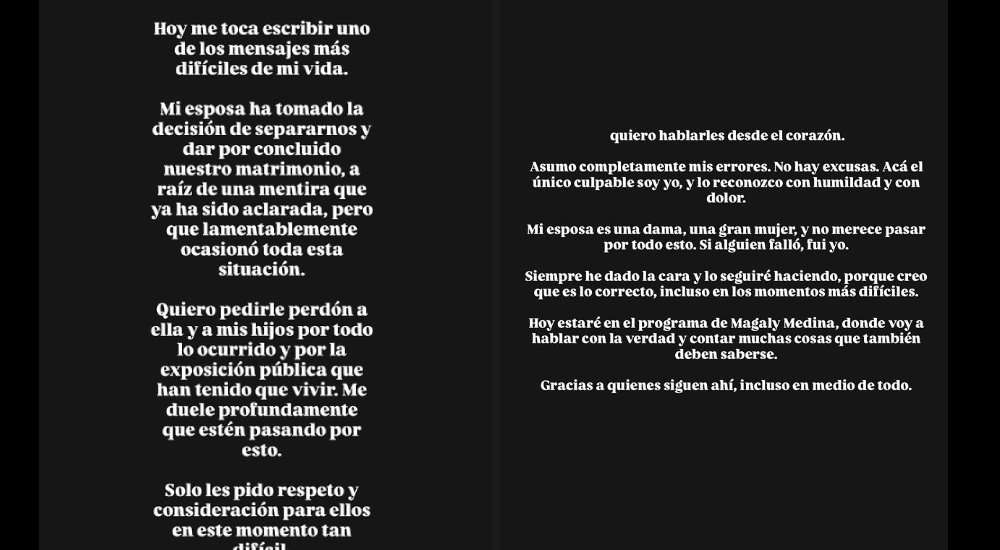 "Hoy me toca escribir uno de los mensajes más difíciles de mi vida. Mi esposa ha tomado la decisión de separarnos y dar por concluido nuestro matrimonio, a raíz de una mentira que ya ha sido aclarada, pero que lamentablemente ocasionó toda esta situación", expresó el exjugador.