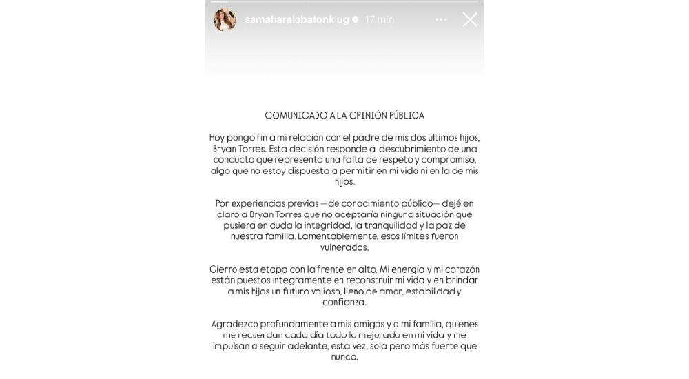 En su mensaje, Samahara Lobatón recordó que ya había dejado claros sus límites debido a situaciones pasadas que fueron de conocimiento público. “Por experiencias previas —de conocimiento público— dejé en claro a Bryan Torres que no aceptaría ninguna situación que pusiera en duda la integridad, la tranquilidad y la paz de nuestra familia. Lamentablemente, esos límites fueron vulnerados”, expresó, dejando ver que la decisión no fue impulsiva, sino producto de hechos que afectaron directamente a su entorno familiar.