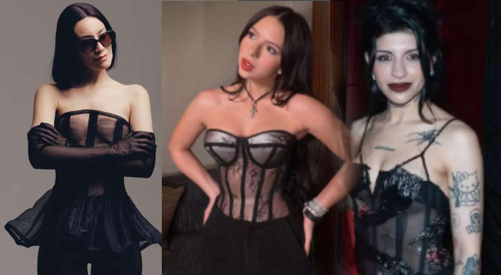 Sin embargo, las comparaciones no tardaron en aparecer, especialmente con el vestuario de Esmeralda Camacho. Seguidores recordaron que la violinista había compartido en Instagram fotografías usando un corset peplum negro con varillas marcadas, transparencias, guantes largos, mallas y gafas oscuras, elementos que muchos consideraron demasiado similares.