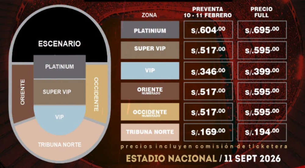 - Super VIP: 517 soles (Preventa) / 595 soles (Precio Full)