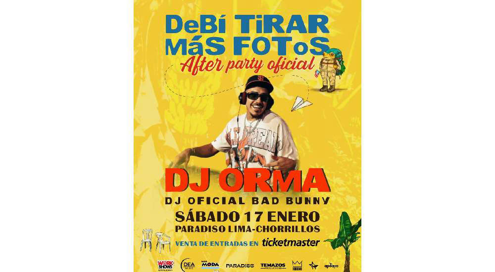El After Party Oficial después del concierto DeBí TiRAR MáS FoToS se realizará con DJ Orma, el DJ oficial del cantante Bad Bunny, este sábado 17 de enero en Paradiso Lima - Club Cultural Lima, Chorrillos.
