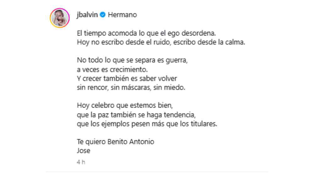 “Hermano: El tiempo acomoda lo que el ego desordena. Hoy no escribo desde el ruido, escribo desde la calma. No todo lo que se separa es guerra, a veces es crecimiento. Y crecer también es saber volver sin rencor, sin máscaras, sin miedo. Hoy celebro que estemos bien, que la paz también se haga tendencia, que los ejemplos pesen más que los titulares. Te quiero Benito Antonio”, expresó J Balvin, sellando así este momento histórico.