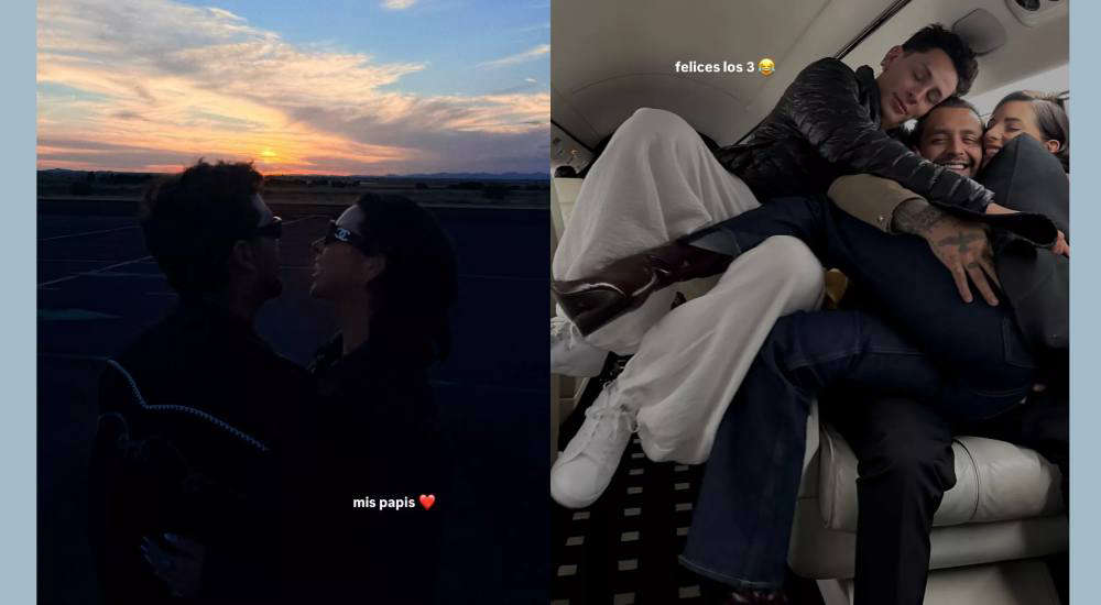 En otra fotografía, Kunno aparece junto a los cantantes dentro de un jet privado, donde los tres se muestran abrazados y sonrientes. Además, el creador de contenido aprovechó para responder con humor a quienes lo critican por “interrumpir” a la pareja. Junto a la foto, escribió “Felices los 3”, dejando claro que todo se trata de una amistad cercana.
