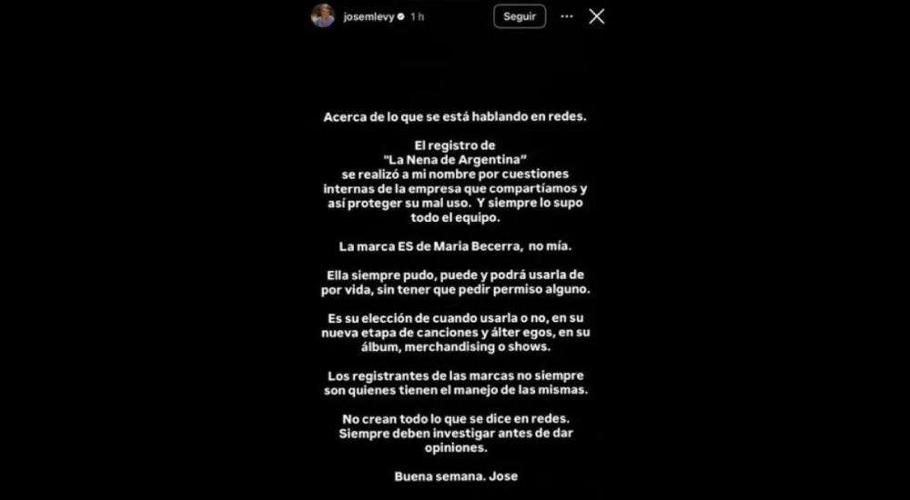 Ante la ola de comentarios, José Levy decidió pronunciarse para aclarar la situación y calmar los rumores. “La marca es de María Becerra, no mía”, escribió en su cuenta de Instagram. También explicó que el registro se hizo con la intención de proteger el nombre artístico de la cantante y evitar que otras personas lo usen de forma indebida.