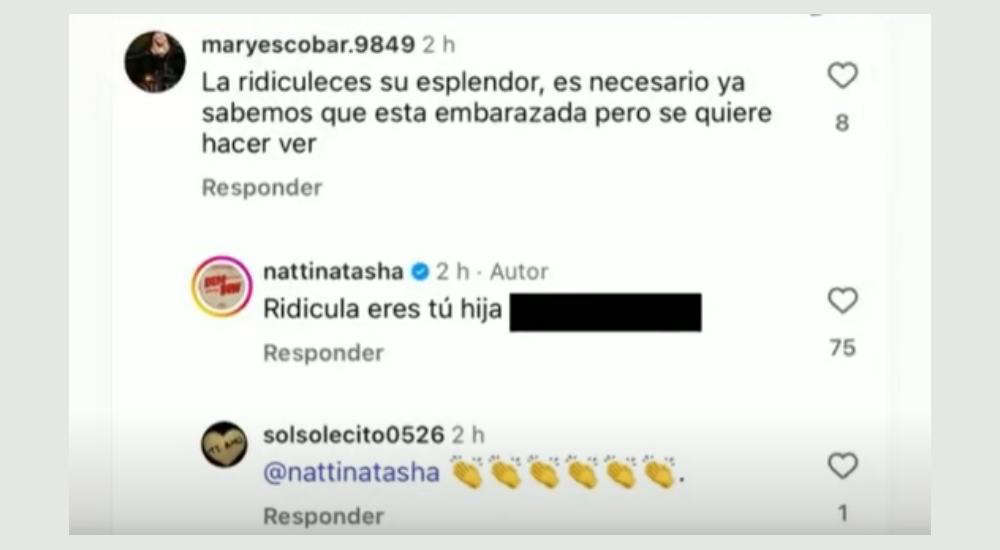 “La ridiculez en su esplendor. ¿Es necesario? Ya sabemos que está embarazada. Se quiere hacer ver”, fue el desatinado comentario de una usuaria que hizo estallar a Natti Natasha. “Ridícula eres tú, hija de la gran…”, fue la fuerte respuesta de la cantante.