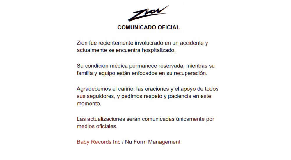 “Zion fue recientemente involucrado en un accidente y actualmente se encuentra hospitalizado. Su condición médica permanece reservada, mientras su familia y equipos están enfocados en su recuperación. Agradecemos el cariño, las oraciones y el apoyo de todos sus seguidores, y pedimos respeto y paciencia en este momento”, fue lo que se leyó.